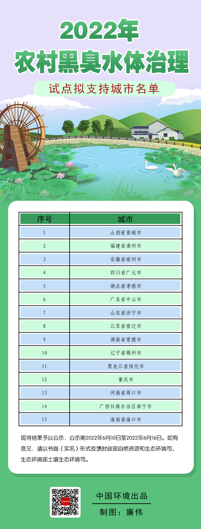 根據競爭性評審結果,財政部、生態(tài)環(huán)境部擬將15個(gè)城市確定為2022年支持的農村黑臭水體治理試點(diǎn)城市,2022年6月10日至2022年6月16日為公示期。期間如有意見(jiàn),請以書(shū)面(實(shí)名)形式反饋財政部自然資源和生態(tài)環(huán)境司、生態(tài)環(huán)境部土壤生態(tài)環(huán)境司。
