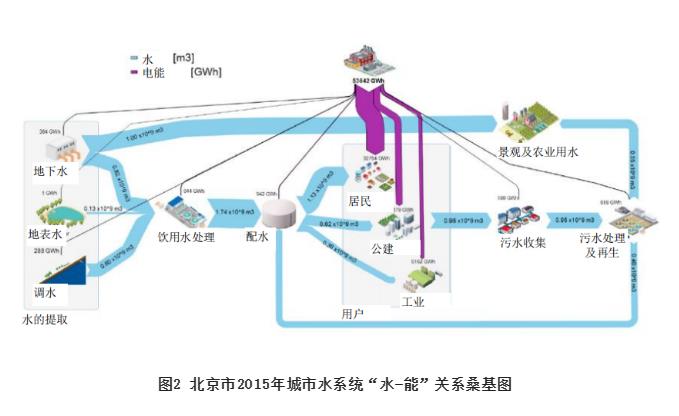 圖2所示給出了北京2015年水系統水量與能耗分配關(guān)系?;鶊D,可以評估城市“水足跡”過(guò)程及能量消耗,在城市尺度上系統評估和多目標優(yōu)化“水-能”關(guān)系,通過(guò)水系統全流程過(guò)程系統規劃、聚焦水循環(huán)每個(gè)鏈條,進(jìn)行傳統工藝改進(jìn)、高效設備及革新性工藝技術(shù)應用,尤其是對排水系統結構優(yōu)化進(jìn)而提升系統能源利用效率,因地制宜地采用污水中資源、能量回收以及清潔能源提取和利用等技術(shù)措施,進(jìn)一步降低水系統能耗和溫室氣體排放,對于提升水系統韌性及可持續至關(guān)重要。