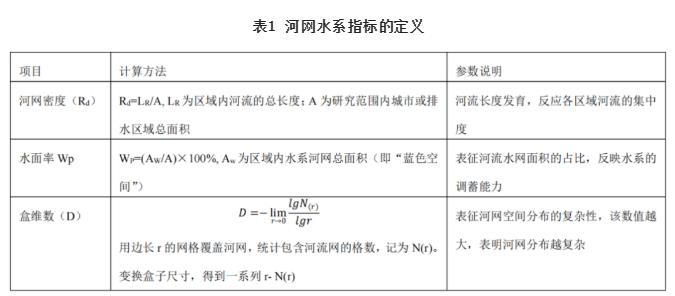 河網(wǎng)調蓄能力是水系在水文方面的重要功能之一,尤其在削減洪峰、降低洪水危害中具有重要的作用。受人類(lèi)活動(dòng)影響,尤其是近半個(gè)世紀年以來(lái)快速城鎮化引起的土地利用方式變化,致使許多城區河流、水塘、水淀區被掩埋甚至完全消失,導致城市水面率大幅減少,河網(wǎng)、水系發(fā)育及演變也表現出由復雜到簡(jiǎn)單、由多元到單一的變化趨勢。世界范圍內60%以上的河流受到城市化的影響,而城市化對河流生態(tài)完整性及生態(tài)功能造成了嚴重威脅;從國內外經(jīng)驗看,這種演變無(wú)疑還會(huì )加劇洪澇災害、水質(zhì)惡化等問(wèn)題。借助河道容蓄指標與水系結構參數的相關(guān)關(guān)系分析河網(wǎng)結構對調蓄能力的影響,常用的水系變化指標包括數量特征參數和復雜性參數,選取河網(wǎng)密度(Rd)、水面率(WP)描述水系的數量特征,河網(wǎng)盒維數描述水系的復雜性特征,各指標計算方法及內涵見(jiàn)表1。