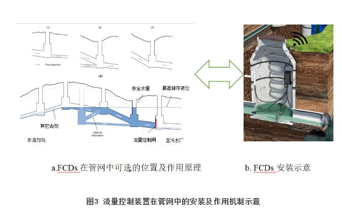 國外的研究和實(shí)際案例表明,基于整個(gè)排水系統的拓撲結構,結合管網(wǎng)水力模擬等手段,選擇在管網(wǎng)關(guān)鍵節點(diǎn)處設置流量控制設備,通過(guò)布局策略、具體安裝數量和位置優(yōu)化,可以實(shí)現雨季對管網(wǎng)在線(xiàn)調蓄能力的充分利用,并實(shí)時(shí)減少CSO及下游管網(wǎng)的流量壓力,見(jiàn)圖3。我國室外排水設計標準缺少在城鎮排水管網(wǎng)適當位置設置流量控制調節設施、設備等方面的具體技術(shù)要求或建議,因此,實(shí)際項目設計往往沒(méi)有考慮對排水系統流量主動(dòng)控制與優(yōu)化分配的必要性,導致暴雨期間無(wú)法實(shí)現對整個(gè)排水管網(wǎng)不同位置或區域的下泄流量和流速的有效控制,以及短時(shí)下游管網(wǎng)承受來(lái)自上游管網(wǎng)超量的流量沖擊進(jìn)而使得下游排水區域的排水不暢、內澇及CSO等現象,甚至在管網(wǎng)薄弱環(huán)節出現突發(fā)性的滿(mǎn)溢和洪澇災害;同時(shí),由于管網(wǎng)中缺乏FCDs,不能充分發(fā)揮管網(wǎng)應有的在線(xiàn)調蓄能力,對末端流量控制易造成瞬時(shí)沖擊和壓力。實(shí)際上,分布式的流量控制設備相對大規?;疑A設施建設更加經(jīng)濟、易于實(shí)施、可持續,因此,改進(jìn)傳統排水管網(wǎng)被動(dòng)接收的排水模式,通過(guò)設置必要的在線(xiàn)流量控制裝置實(shí)現排水系統峰值流量管控,向“空間”換“時(shí)間”的主動(dòng)控制方向轉變,對于增加汛期排洪防澇的靈活性、提升排水系統韌性和可靠性等方面至關(guān)重要。