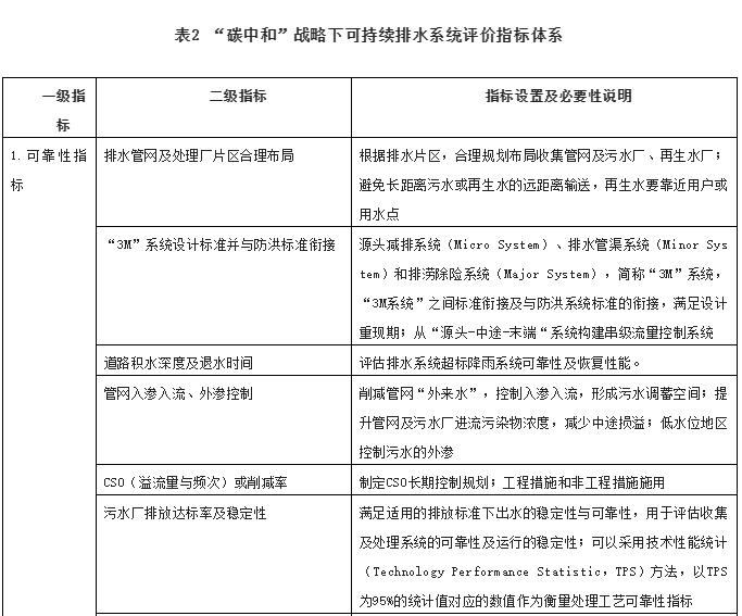 基于上述分析,“碳中和”格局下隨著(zhù)氣候變化影響下不確定性天氣日益增加,水系統作為市政基礎設施要成為韌性城市總體規劃的重要組成部分,也要主動(dòng)適應不斷變化的外在環(huán)境壓力及相關(guān)條件的約束而不斷調整和優(yōu)化框架、技術(shù)和管理體系;從另一角度看,低碳既是水系統面臨的壓力,更是給水務(wù)和環(huán)境行業(yè)帶來(lái)了新的技術(shù)發(fā)展驅動(dòng)力、商業(yè)模式創(chuàng )新和發(fā)展機遇。水務(wù)行業(yè)要系統性構建以韌性、可靠性與可持續性為基本特征的面向未來(lái)的城鎮排水系統框架,至關(guān)重要的問(wèn)題是,可持續城市排水系統構建需要跨學(xué)科、跨部門(mén)的協(xié)作和共同實(shí)踐,問(wèn)題在于所涉及的社會(huì )和技術(shù)復雜性,以及對水系統面臨的綜合挑戰和系統解決方案的范圍缺乏共同的理解和認知,推進(jìn)可持續排水系統的構建不是一件容易的事情。目前,國內外尚缺乏“碳中和”戰略下可持續排水系統評價(jià)指標體系,為此將系統可靠性、韌性、低碳、生態(tài)安全性、智慧監測與控制及非工程性措施與利益相關(guān)方的積極參與六個(gè)維度設置為一級指標,在一級指標基礎上細化為47項二級指標,具體見(jiàn)表2。需要說(shuō)明的是,不同指標之間可能會(huì )存在一些內在的邏輯關(guān)系和相互影響,但是排水系統本身就是一個(gè)多維度、多層次、多因素、多目標復雜交織的體系,需要各個(gè)專(zhuān)業(yè)的共同協(xié)作和推進(jìn)。