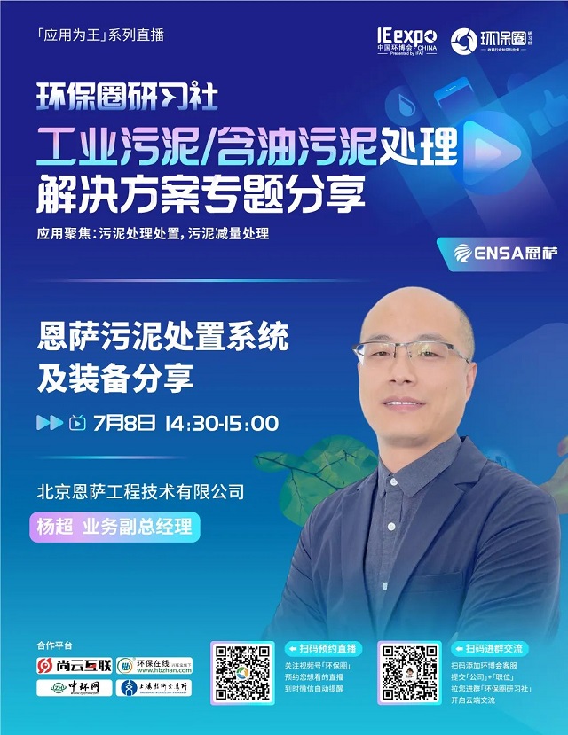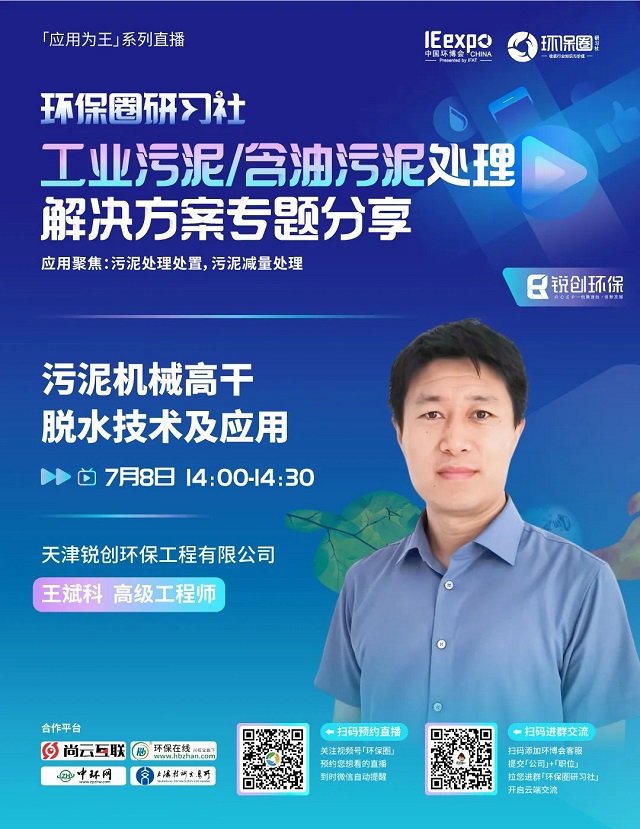 7月8日(星期五)下午14:00-15:30,環(huán)保圈研習社“應用為王”系列直播工業(yè)污泥/含油污泥處理解決方案專(zhuān)題分享,有幸邀請到了銳創(chuàng )環(huán)保、北京恩薩、江蘇康泰環(huán)保3家企業(yè)的技術(shù)專(zhuān)家做客直播間,聚焦工業(yè)污泥/含油污泥處理,為大家分享污泥處理處置,污泥減量處理解決方案。