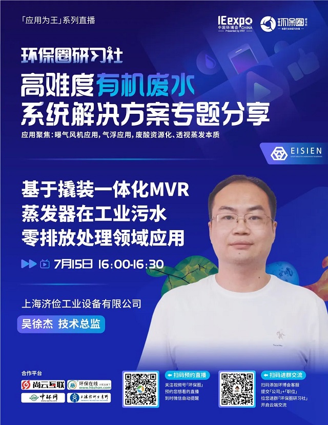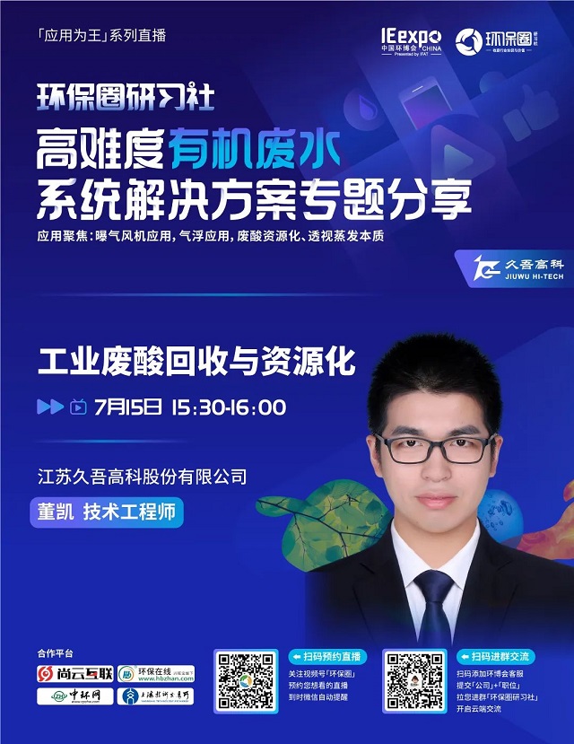 7月15日(星期五)下午14:00-16:30,環(huán)保圈研習社“應用為王”系列直播高難度有機廢水系統解決方案專(zhuān)題分享,有幸邀請到了艾珍機械、求是膜、工源環(huán)境、久吾高科、上海濟儉5家企業(yè)的技術(shù)專(zhuān)家做客直播間,與我們共同探討“水環(huán)境”污染處理問(wèn)題,并為大家帶來(lái)高難度有機廢水的節能處理、資源化利用、零排放處理等相關(guān)技術(shù)及解決方案分享。