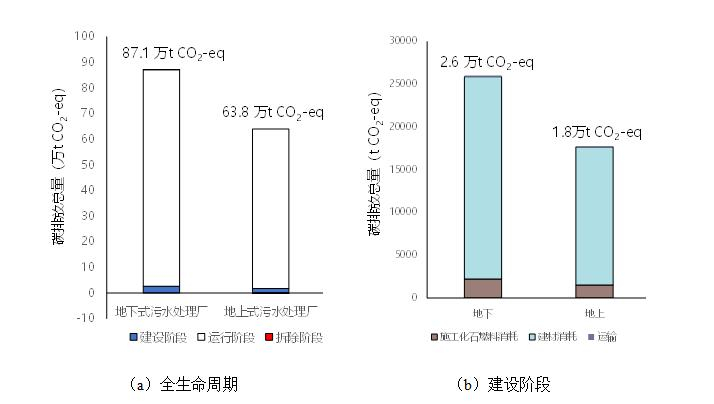 地下式污水處理廠(chǎng)產(chǎn)生的綜合環(huán)境與投資影響(LCCI)較同等規模與工藝的地上式污水處理廠(chǎng)高出21%,全生命周期碳排放較地上式高出36.5%。即使地下廠(chǎng)地面部分留作綠地園林景觀(guān),所產(chǎn)生生態(tài)效益也無(wú)法抵消對環(huán)境產(chǎn)生的總的負面影響。