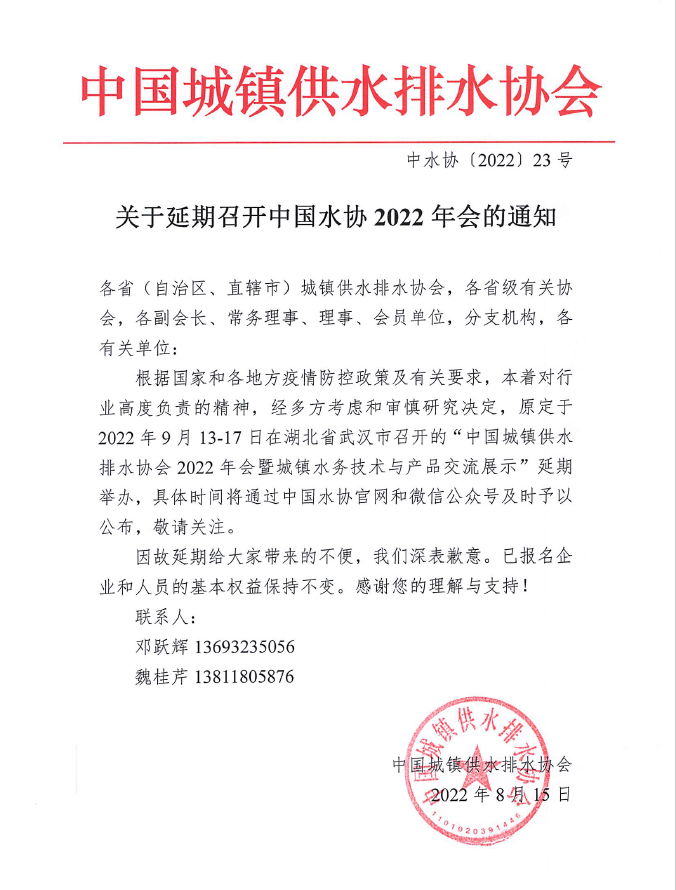 關(guān)于延期召開(kāi)中國水協(xié)2022年會(huì )的通知