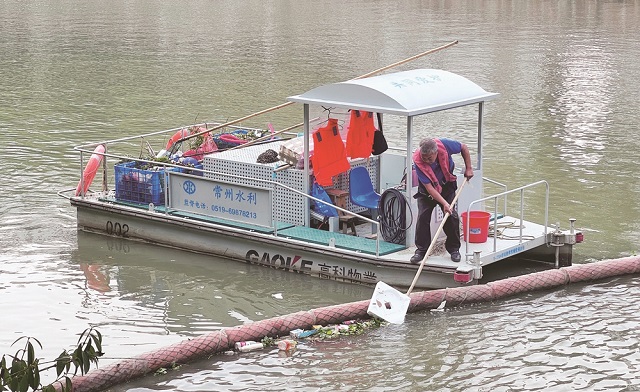 河道保潔員在打撈被漂浮物攔截設施攔下的河面垃圾。