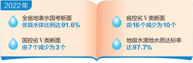 我省持續深入推進(jìn)水污染治理,集中攻堅消除劣Ⅴ類(lèi)水質(zhì)斷面,全面提升水生態(tài)環(huán)境質(zhì)量。2022年,4項約束性指標超額完成國考目標。其中,全省地表水國考斷面優(yōu)良水體比例達91.6%;國控劣Ⅴ類(lèi)斷面由7個(gè)減少為3個(gè),省控由16個(gè)減少為10個(gè),降幅明顯。地級水源地水質(zhì)達標率達到97.7%。