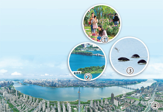 圖①:市民在濱江月季園游玩。馬悅 攝 圖②:象湖濕地公園。馬悅攝 圖③:在贛江水域嬉戲的江豚。余會(huì )功攝 圖④:穿南昌城而過(guò)的贛江。