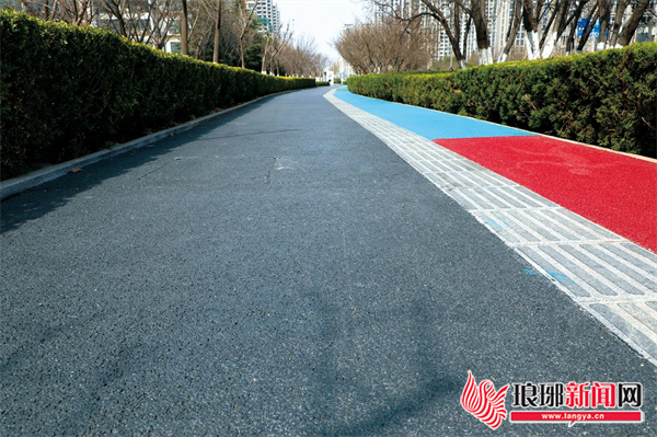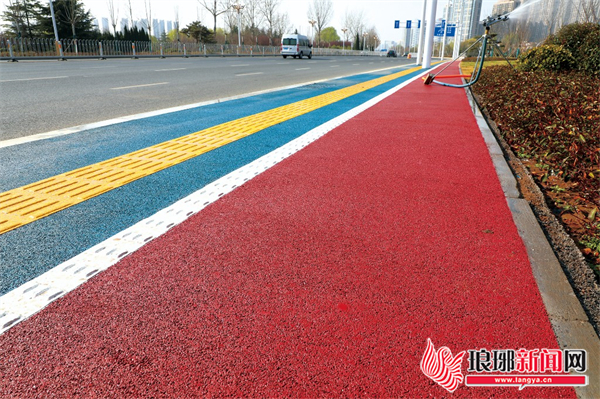 武漢路(蒙河路-沂蒙路)人行道改造工程全長(cháng)400米,寬3米,面積1200平方米。工程采用透水混凝土工藝進(jìn)行鋪設,結構層為10厘米透水混凝土基層加5厘米彩色透水混凝土面層,有效提高城市道路的雨水滲透能力、高散熱性能和景觀(guān)功能。