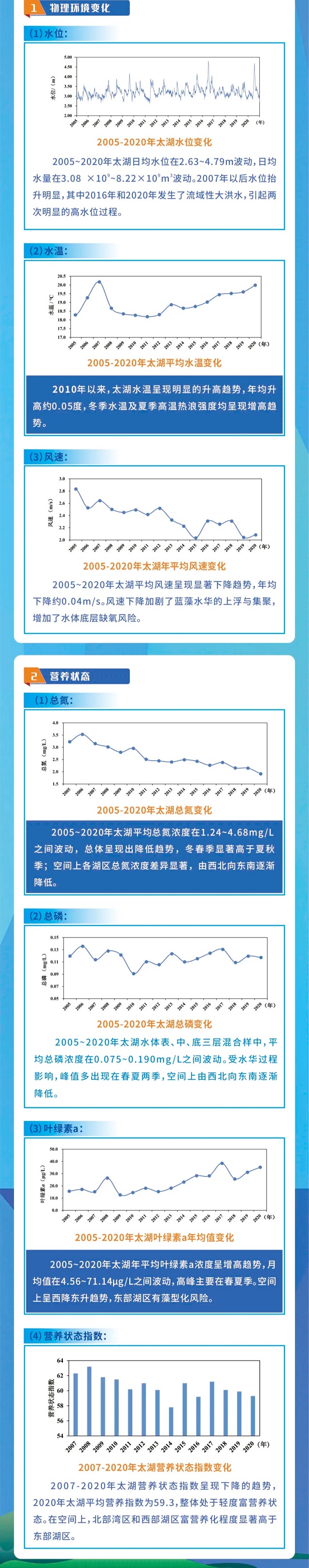 15年間,太湖物理環(huán)境變化顯著(zhù)。其中水位變化方面,2005——2020年間,太湖日均水位在2.63——4.79m波動(dòng),日均水量在3.08×10?~8.22×10?m3波動(dòng)。2007年以后水位抬升明顯,其中2016年和2020年發(fā)生了流域性大洪水,引起兩次明顯的高水位過(guò)程;平均水溫變化方面,2010年以來(lái),太湖水溫呈現明顯的升高趨勢,年均升高約0.05℃,冬季水溫及夏季高溫熱浪強度均呈現增高趨勢;平均風(fēng)速變化方面,2005——2020年太湖平均風(fēng)速呈現顯著(zhù)下降趨勢,年均下降約0.04m/s。風(fēng)速下降加劇了藍藻水華的上浮與集聚,增加了水體底層缺氧風(fēng)險。