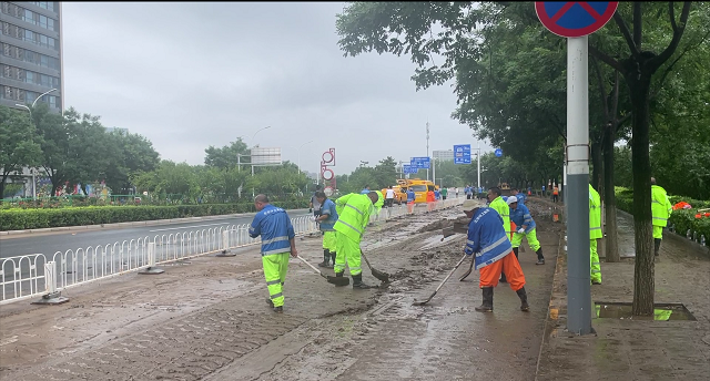 現場(chǎng),北京環(huán)衛集團的相關(guān)人員正抓緊對這些淤積泥沙進(jìn)行清理。在公路上,大型鏟車(chē)、多功能作業(yè)利用車(chē)前的刮板,把淤泥鏟起并堆積起來(lái),再用大型清運車(chē)輛拉走后進(jìn)行沖洗作業(yè)。而在人行道上,工作人員主要通過(guò)人工作業(yè),利用鐵鍬等工具將路面清理干凈。