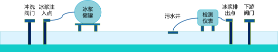 冰漿清洗技術(shù)是將冰漿加注進(jìn)管道內,使冰漿在管道內形成一段柔軟的“冰活塞”,再利用市政管道上游水壓推動(dòng)“冰活塞”向前移動(dòng),在移動(dòng)時(shí)冰漿與管道內壁發(fā)生碰撞及摩擦,使管底沉積物與管壁附著(zhù)物的穩定結構遭到破壞,從而剝離管壁并隨著(zhù)冰漿一起向前移動(dòng)直至排出管道,最終達到清洗管道的目的。