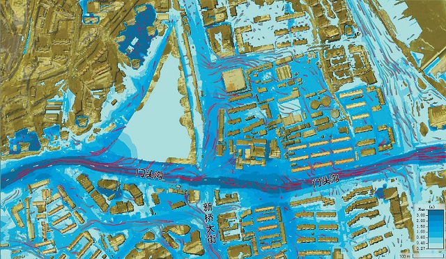以受災較嚴重的門(mén)頭溝和中門(mén)寺溝兩個(gè)流域為例,8月1日雨勢減小后,工作組即刻到山洪沖擊地區進(jìn)行現場(chǎng)調研,收集實(shí)地洪水排泄及淹沒(méi)資料;8月4日開(kāi)始搭建洪水反演模擬模型,經(jīng)過(guò)近20次的驗證調試,模擬結果基本符合實(shí)際。經(jīng)過(guò)驗證的模型,可以模擬不同降雨條件下洪水和城市內澇的淹沒(méi)情況,為災后恢復重建、長(cháng)遠高質(zhì)量發(fā)展提供決策支持。