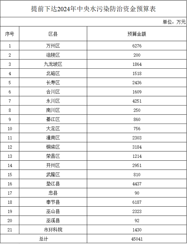 根據《重慶市財政局關(guān)于提前下達2024年中央水污染防治資金預算的通知》,為促進(jìn)水環(huán)境質(zhì)量改善,加快推進(jìn)水污染防治工作,筑牢長(cháng)江上游重要生態(tài)屏障,根據財政部《關(guān)于提前下達2024年水污染防治資金預算的通知》(財資環(huán)〔2023〕111號)、《水污染防治資金管理辦法》(財資環(huán)〔2021〕36號)等文件精神,并按照重慶市生態(tài)環(huán)境局《關(guān)于商請提前下達2024年中央水污染防治資金預算的函》(渝環(huán)函〔2023〕625號),現將2024年中央水污染防治資金預算提前下達,專(zhuān)項用于水污染防治和水生態(tài)環(huán)境保護方面相關(guān)工作。