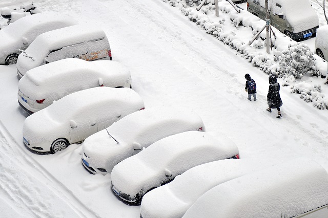 圖為山東省煙臺市福山區市民在雪中出行。圖源人民圖片網(wǎng)