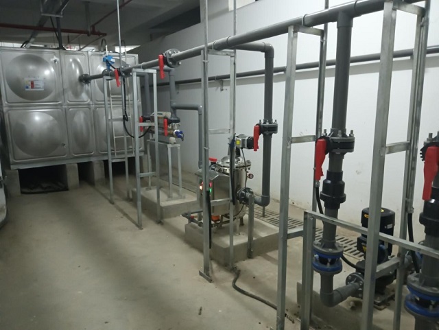 建筑內,也“別有洞天”——設置雨水回收系統,收集屋面及道路雨水后,采用“就地預處理單元+生化處理系統”工藝將凈化后的雨水輸送到清水箱中,用于場(chǎng)地內綠化的澆灌,以“水循環(huán)”實(shí)現水資源高效利用。