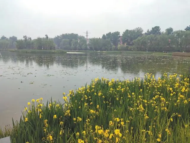 5月10日下午,北京迎來(lái)一場(chǎng)陣雨,記者前往龍潭西湖公園探訪(fǎng)。雨下得不小,但公園內的路面上卻沒(méi)有什么積水,這是因為步道鋪設的大量透水磚使得雨水可以快速下滲。走近湖邊,一大片盛放的黃色鳶尾花在雨中顯得越發(fā)嬌艷。