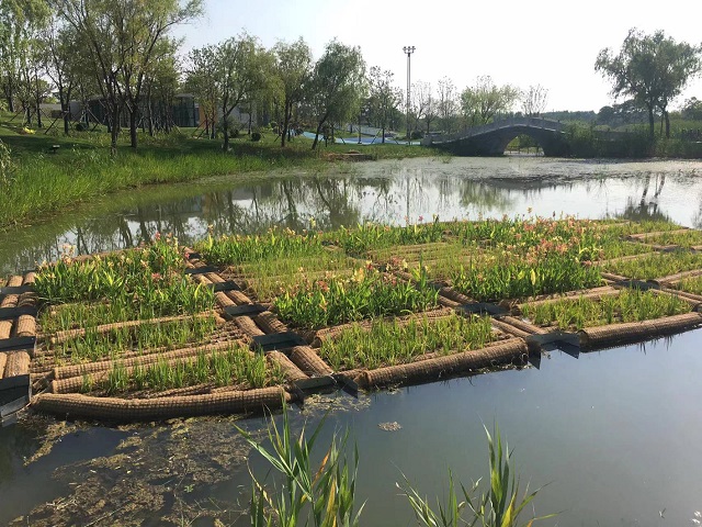 公園中部,寬闊的紫薇大道南北貫穿,連接南北入口。在大道最北端一座橋梁的北側,建設了2個(gè)雨水花園,收集周?chē)挠晁?,里面栽種了細葉美女櫻、彩虹石竹、花葉玉簪、紫葉山桃草、花葉美人蕉、細葉芒、矮生蘆竹等多種植物。橋西的河面上,還設置了以太陽(yáng)能作動(dòng)力的生態(tài)浮床,用于改善河道水質(zhì)。河道沿線(xiàn)還建設了可溢流生態(tài)屏障,雨水進(jìn)入可溢流生態(tài)屏障,利用植物根系、漂浮濕地、人工水草作為掛膜基質(zhì),通過(guò)生物接觸氧化技術(shù)對微污染雨水進(jìn)行凈化,從而控制外源污染對自然水體水質(zhì)的影響。栽植的植物品種主要有常綠鳶尾、千屈菜、再力花、苦草等。