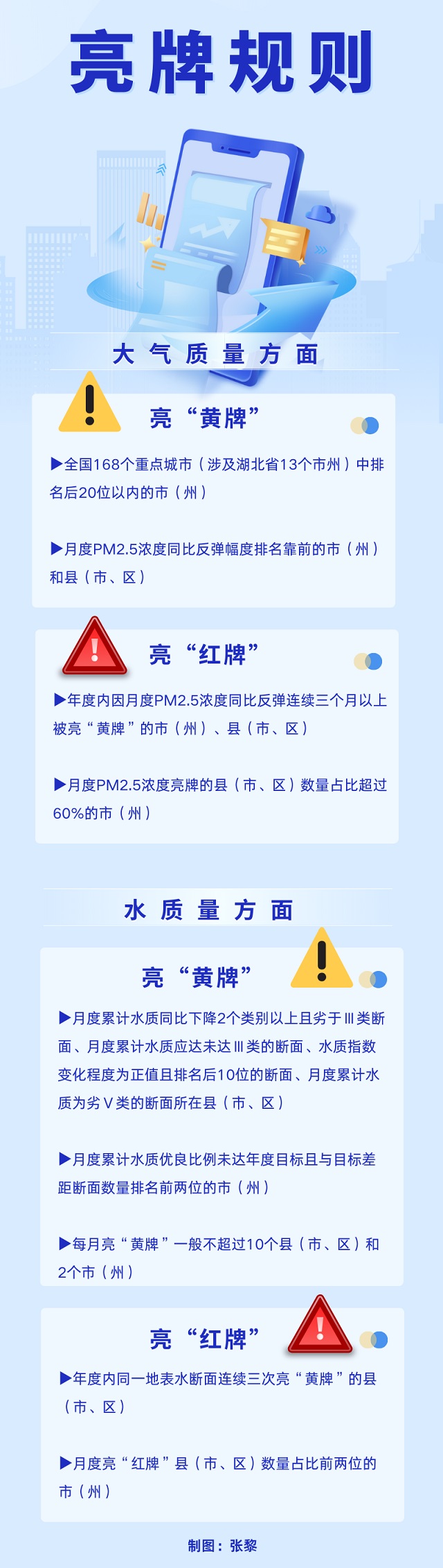 具體而言,大氣質(zhì)量方面,對全國168個(gè)重點(diǎn)城市(涉及湖北省13個(gè)市州)中排名后20位以?xún)鹊氖校ㄖ荩┝痢包S牌”;年度內因月度PM2.5濃度同比反彈連續3個(gè)月以上被亮“黃牌”的市(州)、縣(市、區),將亮“紅牌”。