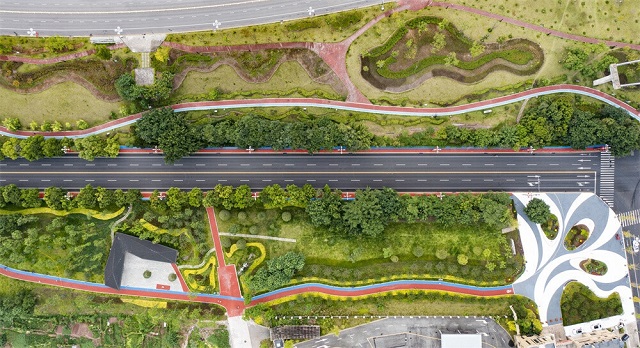 而今,大家口中的“濺水路”,在海綿城市建設中得以“翻新”“走紅”。從無(wú)人機視角俯瞰,現在的會(huì )展街好似一條“彩虹路”,車(chē)輛雙向四車(chē)道上通行有序,行人在五彩游步道上觀(guān)美景、嗅花香。