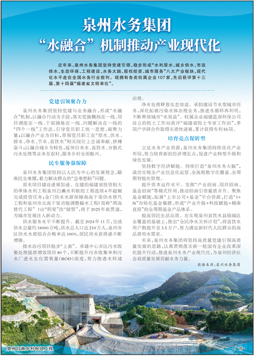 立足水務(wù)產(chǎn)業(yè)資源,泉州水務(wù)集團持續優(yōu)化產(chǎn)業(yè)布局,努力培育新的經(jīng)濟增長(cháng)點(diǎn),促進(jìn)產(chǎn)業(yè)轉型升級和綠色發(fā)展。