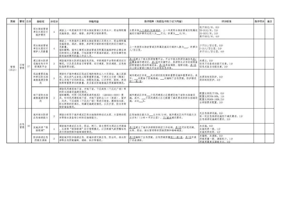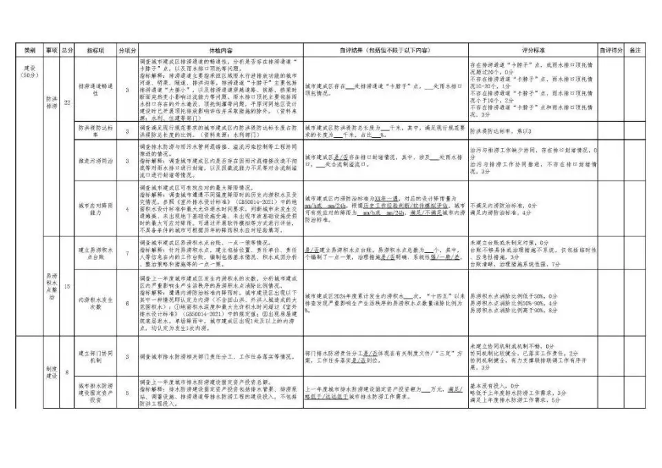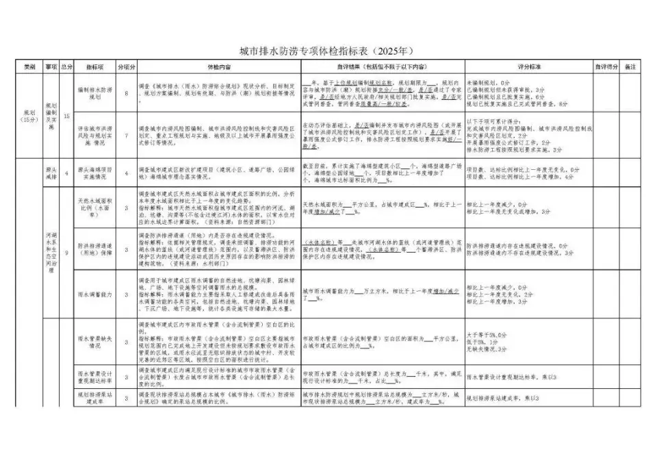 為深入貫徹落實(shí)黨中央、國務(wù)院決策部署,建立城市內澇治理評估機制,我們在2024年組織開(kāi)展城市排水防澇專(zhuān)項體檢自評估的基礎上,研究更新了《城市排水防澇專(zhuān)項體檢指標表(2025年)》(見(jiàn)附件,以下簡(jiǎn)稱(chēng)“指標表”),現印發(fā)給你們。請你們結合2025年汛前準備、隱患排查等工作,組織開(kāi)展城市排水防澇專(zhuān)項體檢自評估,全面排查城市防洪排澇體系的問(wèn)題短板和薄弱環(huán)節。專(zhuān)項體檢要覆蓋全部城市(包括地級及以上城市、縣級市,不含下轄縣、鄉、鎮)。針對體檢發(fā)現的問(wèn)題,屬于本部門(mén)的,要明確措施和整改時(shí)限,持續推進(jìn)解決;需要相關(guān)部門(mén)解決的,城市建設(排水)部門(mén)要報告屬地政府,及時(shí)反饋和移交。