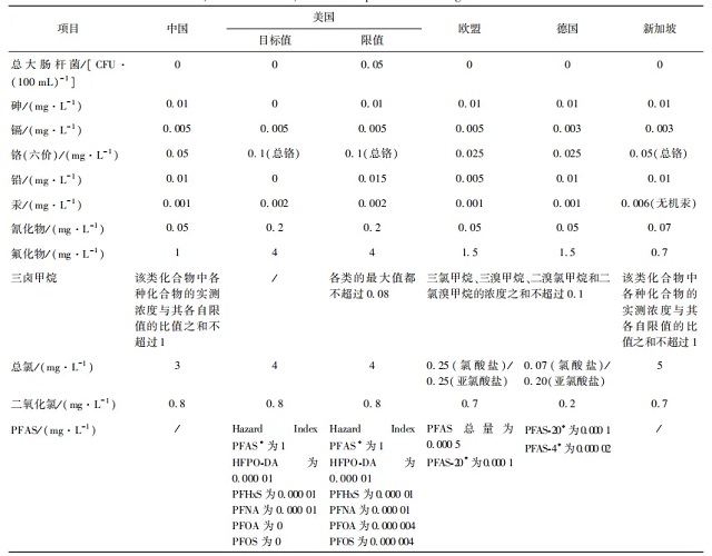 注:?表示美國標準中一種基于健康風(fēng)險的水質(zhì)目標值,是理論上的“無(wú)風(fēng)險”濃度水平,對所有人群(包括敏感人群,如兒童和免疫力低下者)都沒(méi)有已知或預期的健康風(fēng)險;HazardIndexPFAS表示美國標準中20種PFAS化學(xué)物質(zhì)的集合;PFAS-4是指包括PFOA、PFNA、PFHxS和PFOS等4種PFAS化學(xué)物質(zhì)的集合。