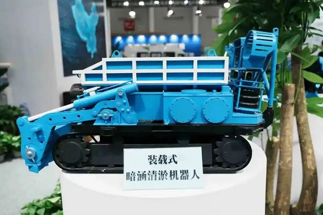 中建三局綠投公司參展的裝載式暗涵清淤機器人已應用于中山小隱涌項目,可適應淤泥板結、生活垃圾,和建筑垃圾混雜等復雜工況,24小時(shí)全天候作業(yè),最大清淤效率達18方每小時(shí),相當于20名工人同時(shí)作業(yè)