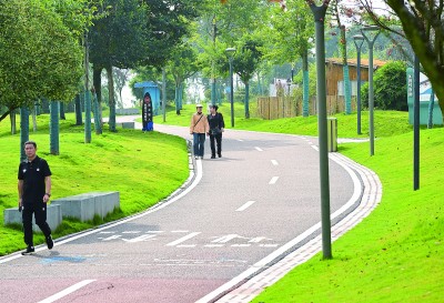 市民在四川宜賓市南溪濱江濕地公園綠道內散步。新華社發(fā)
