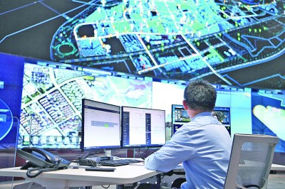 工作人員在中新天津生態(tài)城智慧城市運營(yíng)中心內監控。新華社發(fā)