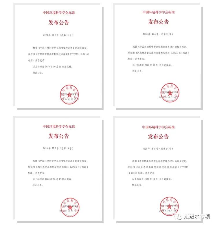 2020年10月10日,課題編制的《沉積物質量基準制定技術指南》(T/CSES 11-2020)、《沉積物質量基準校驗技術指南》(T/CSES 12-2020)、《水生態學基準制定技術指南》(T/CSES 13-2020)及《水生態學基準值現場校驗技術指南》(T/CSES 14-2020)4項標準由中國環境科學學會發布,為準確制定我國流域地表水環境質量相關基準及標準提供科學依據。