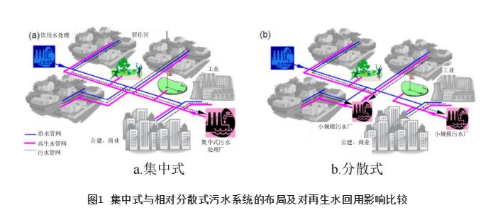①集中建設大規模污水處理系統具有較大的系統風(fēng)險性,適度分散的污水處理系統不但提升了整個(gè)城市的排水系統總體韌性與可靠性,同時(shí)也有利于高品質(zhì)再生水作為城市第二水源的就地短距離回用,也減少了污水收集管網(wǎng)多次提升及截污干管的工程量,避免了再生水遠距離泵送導致的巨量投資及運行的高能耗。集中式與相對分散式污水系統的布局及對再生水回用影響比較見(jiàn)圖1。