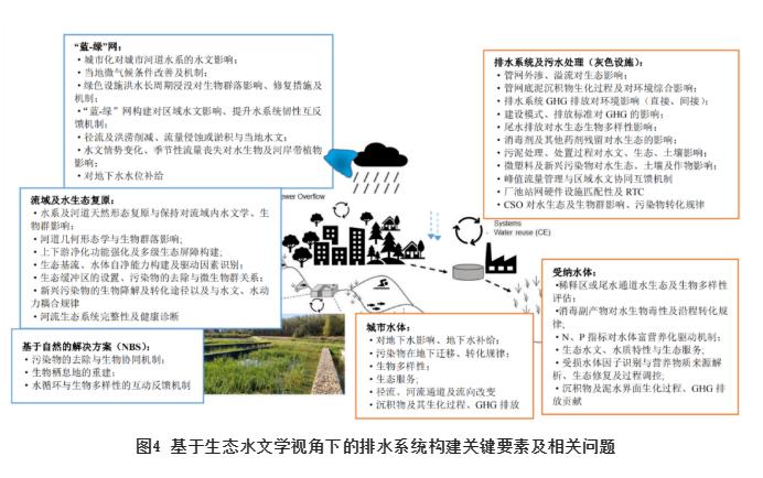 傳統城市排水系統的規劃、設計與實(shí)施環(huán)節可歸結為“水量”和“水質(zhì)”兩個(gè)維度,缺乏跨學(xué)科性且統籌不足,因此在規劃設計中融入生態(tài)水文措施可以彌補傳統排水設施的剛性缺欠。近年來(lái),在“海綿城市”理念引領(lǐng)下,一些基于自然的解決方案(Nature-based solutions ,NBS) 得到應用。盡管NBS是為特定目的而設計的(如城市排水),但它可以同時(shí)提供多種生態(tài)系統服務(wù),如雨水自然處理和滲濾、蒸發(fā)和生物多樣性保持等。通過(guò)對近些年的一些實(shí)踐案例調研發(fā)現,個(gè)別具有“生態(tài)”特征的綠色基礎設施項目,從“現代生態(tài)水文學(xué)”角度來(lái)評價(jià),則會(huì )發(fā)現其在城市水文、生物多樣性及水生態(tài)服務(wù)等維度上缺乏系統性統籌,因此,應從排水系統或者全域水資源系統管理角度,充分考慮水的社會(huì )循環(huán)擾動(dòng)對自然水文及生物多樣性的影響。城市級流域尺度上水系統不同要素之間的關(guān)聯(lián)及相互作用關(guān)系見(jiàn)圖4。