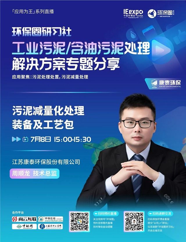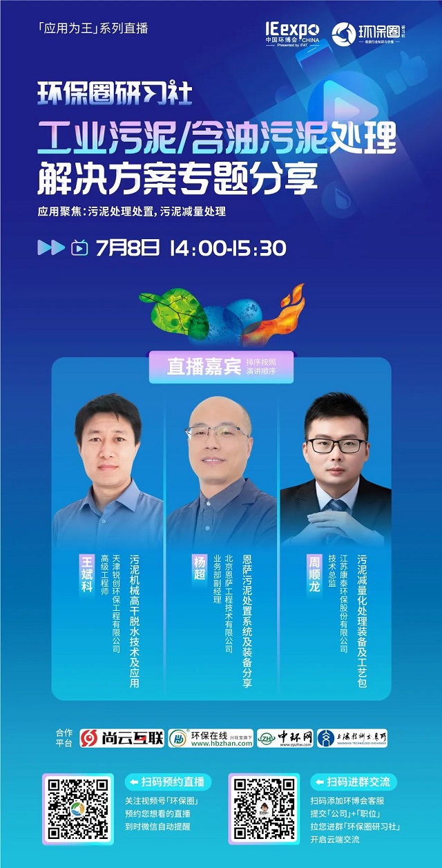7月8日(星期五)下午14:00-15:30,環(huán)保圈研習社“應用為王”系列直播工業(yè)污泥/含油污泥處理解決方案專(zhuān)題分享,有幸邀請到了銳創(chuàng )環(huán)保、北京恩薩、江蘇康泰環(huán)保3家企業(yè)的技術(shù)專(zhuān)家做客直播間,聚焦工業(yè)污泥/含油污泥處理,為大家分享污泥處理處置,污泥減量處理解決方案。