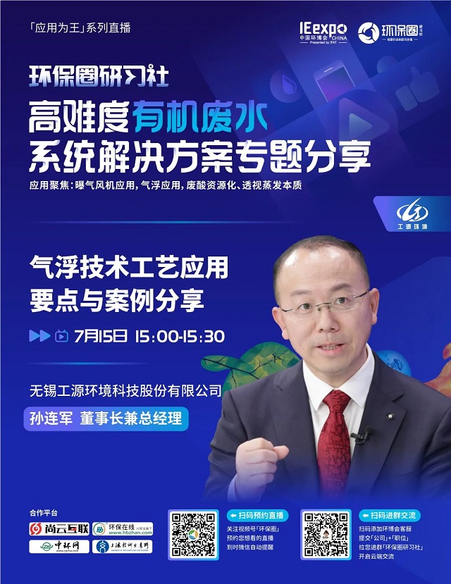 本場(chǎng)直播由工源環(huán)境董事長(cháng)兼總經(jīng)理孫連軍先生——擁有近30年環(huán)保行業(yè)從業(yè)經(jīng)驗的環(huán)保人,親自為您講解氣浮技術(shù)工藝應用要點(diǎn),并帶來(lái)大量現場(chǎng)應用實(shí)例展示,如果您的項目有提標除磷、河湖水體除藻治理、高濃廢水(廚余垃圾、屠宰、養殖、垃圾滲濾液、化工廢水等)這些困擾,更不能錯過(guò)本場(chǎng)直播!