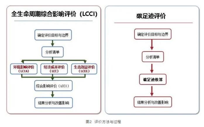 評價(jià)方法采用全生命周期綜合影響指標(LCCI,見(jiàn)參考文獻1)與碳足跡核算評價(jià)方法(見(jiàn)參考文獻2),評價(jià)方法與過(guò)程如圖2所示。