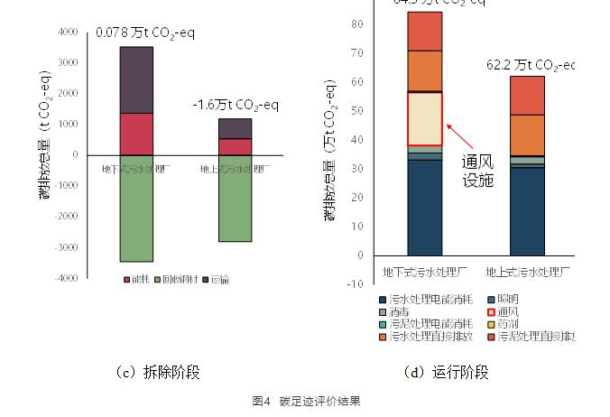 案例污水處理廠(chǎng)全生命周期碳足跡評價(jià)結果如圖4所示。地下廠(chǎng)全生命周期總碳排放量約87.1 萬(wàn)t CO2-eq,較地上廠(chǎng)高36.5%,其中,運行階段碳排放量可達總量的95%以上。由于地下工程結構,地下廠(chǎng)在建設(圖6b)與拆除階段(圖6c)中,需要額外的施工量與建材消耗;在運行階段(圖6c),則需額外通風(fēng)、照明等電力消耗。因此,地下廠(chǎng)運行階段(20年)總碳排放量較地上式高35.8%;其中,地下廠(chǎng)額外通風(fēng)產(chǎn)生的碳排放量約18.4萬(wàn)t CO2-eq,占總排放量的22%??梢?jiàn),地下式污水處理廠(chǎng)全生命周期中會(huì )產(chǎn)生大量碳排放,不符合碳減排、碳中和的社會(huì )發(fā)展方向。