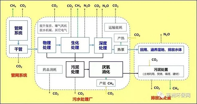 污水處理過(guò)程實(shí)際就是碳排放的過(guò)程,污水處理行業(yè)的碳排放量約占全社會(huì )總排放量的1%,在環(huán)保產(chǎn)業(yè)中占比最大。污水處理過(guò)程中會(huì )排放二氧化碳、甲烷和氧化亞氮。其中,二氧化碳主要來(lái)源于污水治理設施的能耗過(guò)程,而水污染物降解產(chǎn)生的二氧化碳則認定為生源性碳排放;甲烷主要來(lái)源于污水處理厭氧環(huán)節,包括管網(wǎng)、厭氧池、化糞池、污泥厭氧消化池等;氧化亞氮主要來(lái)源于污水處理過(guò)程的硝化反硝化階段。