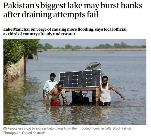 報道稱(chēng),為避免造成更大損害,政府官員們已于周日(當地時(shí)間9月4日)對曼查爾湖采取泄洪措施。他們表示,雖然此舉可能會(huì )使10萬(wàn)人被迫離開(kāi)家園,但同時(shí)也會(huì )讓人口更稠密的地區免遭洪水侵襲。