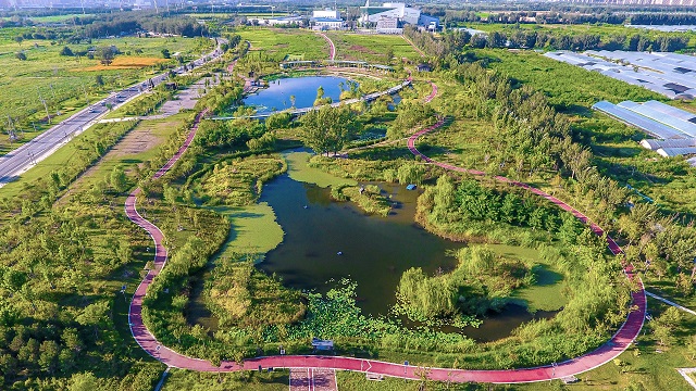 “我們通過(guò)利用植物與水系形成山水環(huán)境,把生態(tài)功能濕地、文化景觀(guān)元素、田園郊野風(fēng)貌、濕地水系景觀(guān)進(jìn)行有機融合,在大尺度上形成由北向南山林環(huán)繞,水系流動(dòng)的空間格局?!迸^饶冉榻B,“通過(guò)水生植物的吸收、濕地填料的吸附、微生物的分解等方式能夠削減面源污染,穩定河道水質(zhì)和保護河道水生態(tài)系統的健康?!?br />