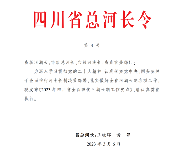 為深入貫徹落實(shí)黨中央、國務(wù)院和省委、省政府關(guān)于全面推行河湖長(cháng)制的決策部署,根據《四川省全面落實(shí)河長(cháng)制工作方案》(川委辦發(fā)電〔2017〕12號)《關(guān)于全面落實(shí)湖長(cháng)制的實(shí)施意見(jiàn)》(川委辦〔2018〕33號)工作安排,持續強化全省河湖長(cháng)制,統籌上下游、千支流、左右岸協(xié)同共治,推動(dòng)江河湖庫生態(tài)保護治理和休養生息,維護河湖健康生命?,F結合我省實(shí)際,制定2023年度工作要點(diǎn)。