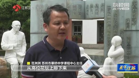 蘇州市草橋中學(xué)課程中心主任范洲洲:“通過(guò)雨水管道從高位花壇上排下來(lái),一部分排到地下的管網(wǎng),還有一部分留在了罐子里,作為植物的灌溉需求?!?br />