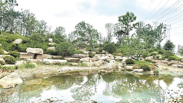 據介紹,該處抽取附近中心溝內的中水,從高處流下,形成疊石瀑布的景觀(guān)。一座座水池,加上周邊層次變化豐富的植被、花卉,形成一個(gè)個(gè)小微濕地,成為梧桐雨的天然蓄水池,向7大區域的周邊植被供水。數據顯示,中水回用可覆蓋片區內214公頃綠化灌溉和水體補給,年節水64.5萬(wàn)立方米,年節約成本187萬(wàn)元。