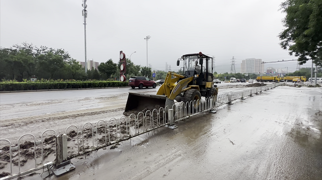 現場(chǎng),北京環(huán)衛集團的相關(guān)人員正抓緊對這些淤積泥沙進(jìn)行清理。在公路上,大型鏟車(chē)、多功能作業(yè)利用車(chē)前的刮板,把淤泥鏟起并堆積起來(lái),再用大型清運車(chē)輛拉走后進(jìn)行沖洗作業(yè)。而在人行道上,工作人員主要通過(guò)人工作業(yè),利用鐵鍬等工具將路面清理干凈。