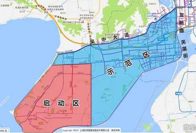 臨湖片區高品質(zhì)供水啟動(dòng)區位于吳中區西側,毗鄰太湖,北至東太湖路,南至大缺港,東至東山大道,西至環(huán)太湖路,總面積約54平方公里,共包含44個(gè)小區,12個(gè)行政村,目前服務(wù)人口數量約為10萬(wàn)人。該片區飲用水主要由吳中新水廠(chǎng)供給,供水規模約2.5萬(wàn)m3/天。