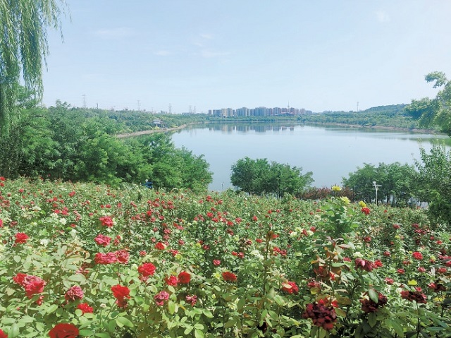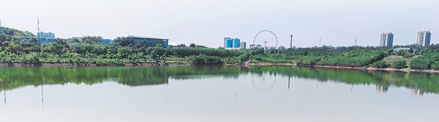 西郊雨洪調蓄工程阜石路砂石坑水面開(kāi)闊,四周植被繁茂。