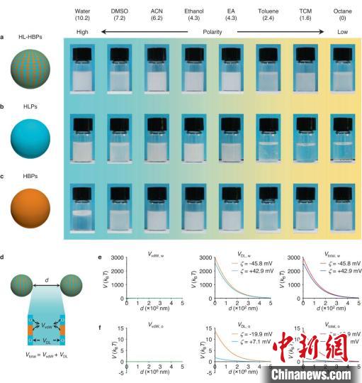 王樹(shù)濤指出,研究團隊在之前基礎上進(jìn)一步研究發(fā)現,親水-疏水異質(zhì)微球表面具有交替的親水、疏水成分,這種結構既有利于高極性溶劑(水)的鋪展,又有利于中等極性溶劑(乙醇等有機溶劑)、低極性溶劑(辛烷等油性有機溶劑)的鋪展。此外,在親水區,很容易引入帶電基團,這些基團能為顆粒間提供靜電排斥作用,從而在不同溶劑中實(shí)現良好的分散。