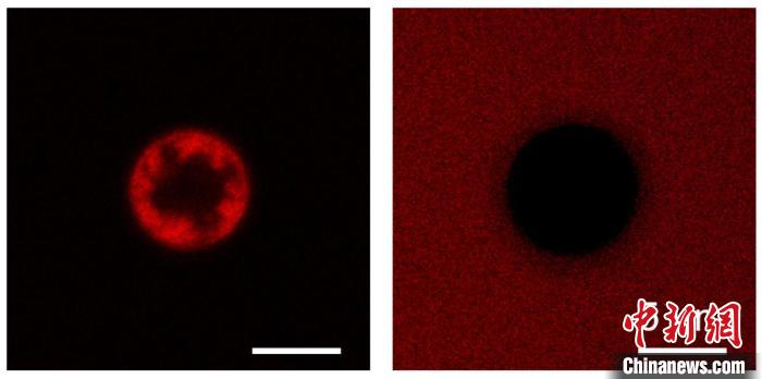 左圖:微球從廢水中捕獲染料的熒光顯微圖像;右圖:微球在有機溶劑中釋放染料的熒光顯微圖像。中國科學(xué)院理化所供圖