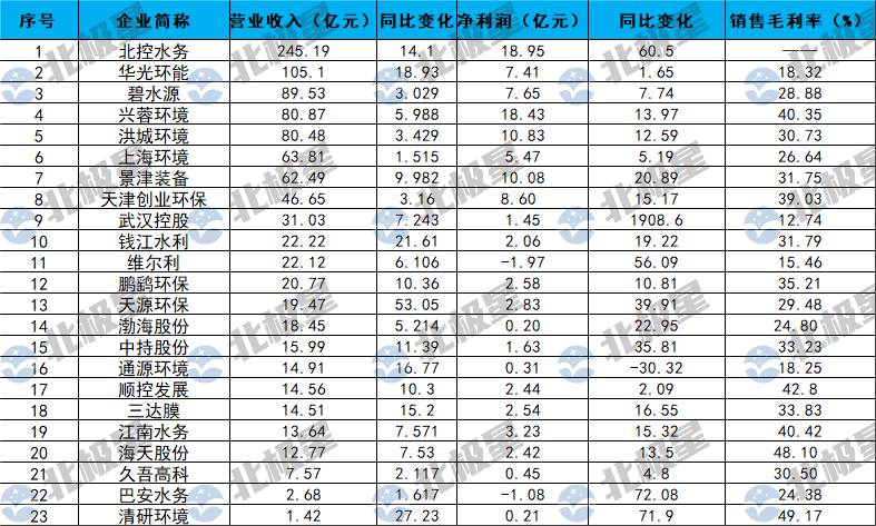 三位百億大咖 營(yíng)業(yè)收入方面,北控水務(wù)營(yíng)業(yè)收入最高,為245.19億元,首創(chuàng )環(huán)保、華光環(huán)能、碧水源、興蓉環(huán)境、洪城環(huán)境、中原環(huán)保、重慶水務(wù)、上海環(huán)境、景津裝備進(jìn)入前十。
