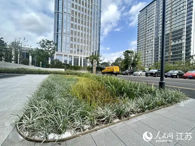 走進(jìn)揚州建工科技園內的綠地,會(huì )發(fā)現一些高出植物的黑色噴頭,這是與雨水回收系統聯(lián)動(dòng)的自動(dòng)灌溉系統。這塊吸滿(mǎn)了水的大“海綿”,不僅可以緩解城市熱島效應,增加地塊的生態(tài)調蓄功能,還將滯留和凈化后的雨水用于園區綠化澆灌和道路噴灑。